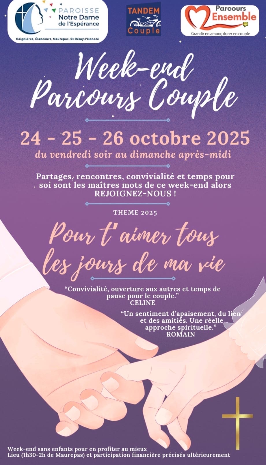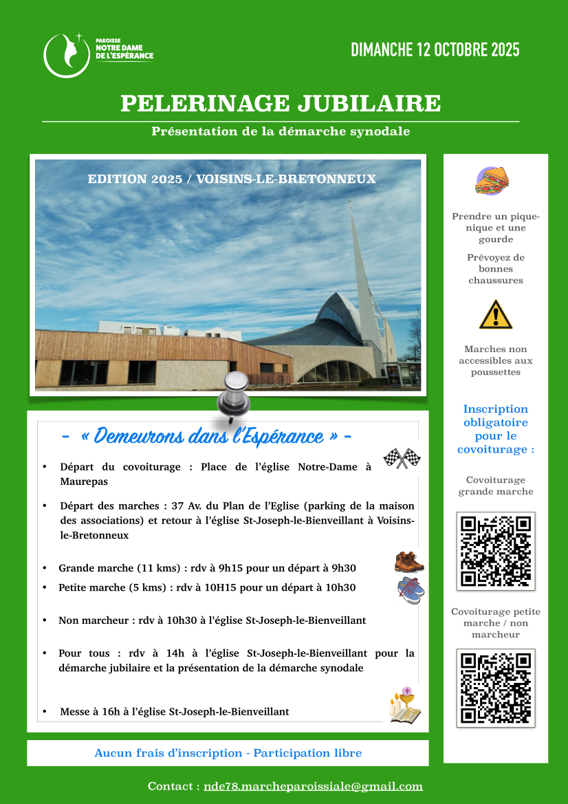 Bienvenue à la Paroisse Notre-Dame de l'Espérance Horaires de messe Demander le baptême Se marier Enterrer un proche Intention de messe Demander un certificat Actualités de la paroisse Le denier est la première source de revenus de l’Église dans votre diocèse. .../... Du 24 au 26 Octobre 12 octobre: Marche paroissiale En octobre: 19h00 à Notre-Dame de Maurepas .../... Édito SPI OClocher Agenda Actualité du diocèse Nous vous Accueillons 4, place du Livradois 78310 Maurepas Contacts paroisse : Ici Secrétariat 01.39.38.22.40 Contacter par mail : Ici Équipe accueil Mercredi 9h30-11h30 Vendredi 18h00 -19h30 Samedi 9h30-11h30